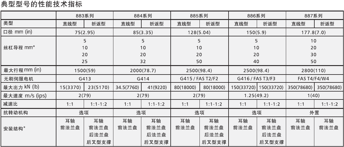 MaxForce 880系列電動缸的伺服電機安裝方式有直線型和折返型兩種,絲杠也可分為滾柱絲杠和滾珠絲桿兩種。它可以提供15KN到350KN的峰值推力,它應用于多種工業(yè)領域,如發(fā)電、金屬成型、壓力機、塑料機械、飛行模擬等;